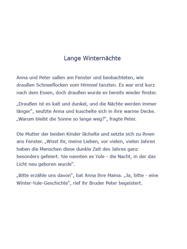 Dieses Buch führt Vorschulkinder auf zauberhafte und leicht verständliche Weise in die Bedeutung des Jahreskreisfestes Yule ein – das ursprüngliche Fest zur Wintersonnenwende – und zeigt die Verbindung zum heutigen Weihnachtsfest. Mit einer kindgerechten Sprache, stimmungsvollen Illustrationen und einer warmherzigen, familiären Atmosphäre vermittelt es Wissen und weckt die Freude an alten Bräuchen.